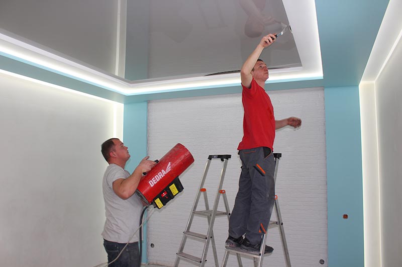 Чтобы сделать качественный монтаж ПВХ пленки, ее нужно разогревать до температуры которая будет выше 65 градусов. С этой операцией хорошо справится газовая тепловая пушка, эффективно нагнетает воздух горячий в комнату. А приводит в действие пушку — сжиженный газ.