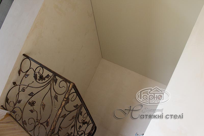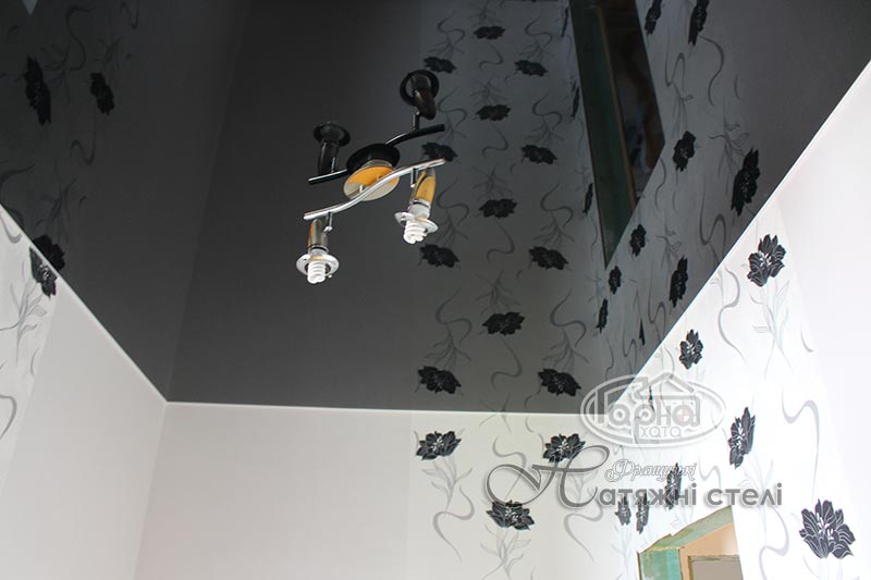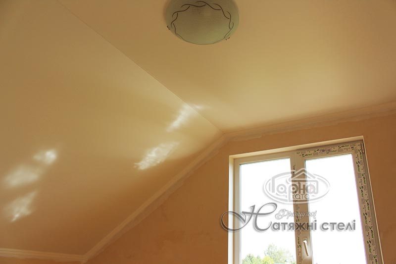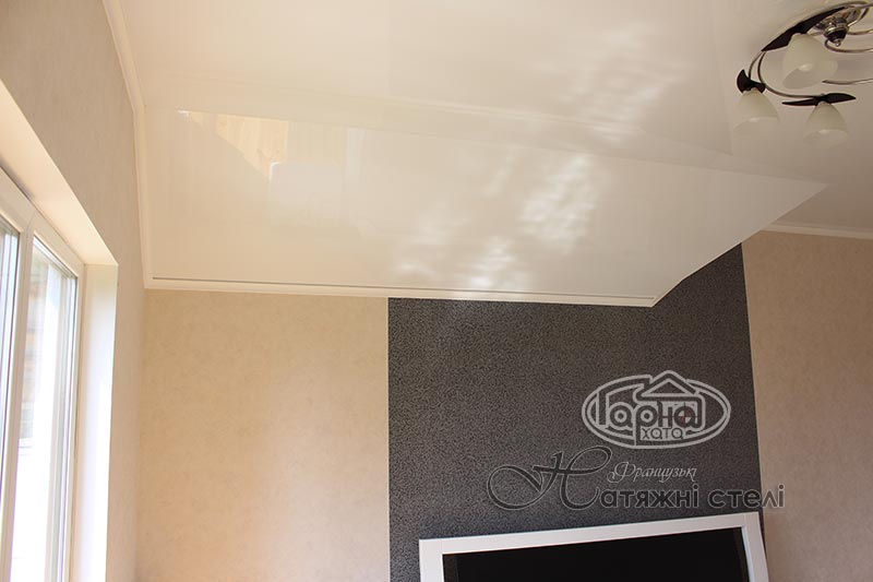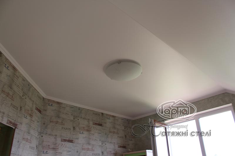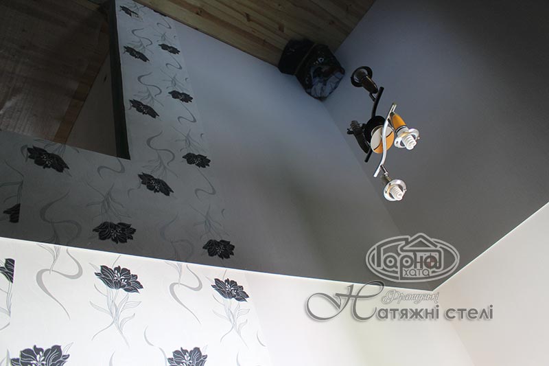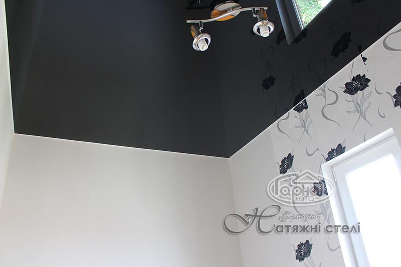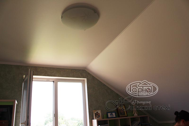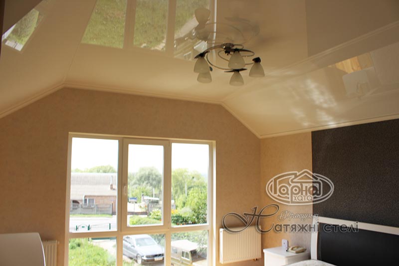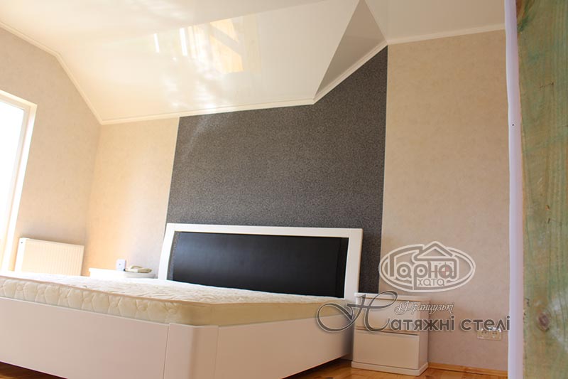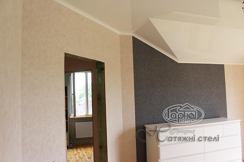 Установлены мансардные натяжные потолки в Луцке в частном доме, дом из сэндвич панелей. На втором этаже в спальне мы видим на фото ломаной потолок, эта конструкция делается с дополнительным сепарационным профилем который закрывается такой же заглушкой. Белый глянец (L 303) визуально увеличивает комнату. В спальне мансардный матовый потолок (MAT 1303) есть потолок который заходит на стену также используется сепарациний профиль. В гардеробной было принято решение установить черный глянцевый потолок (L 347) также визуально увеличивает пространство комнаты. Миф что «может давить на голову» развеян.