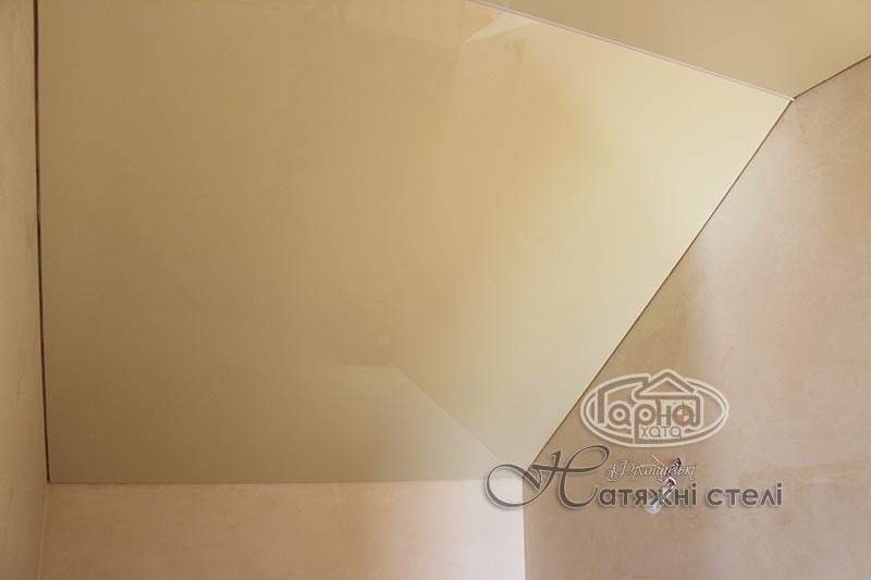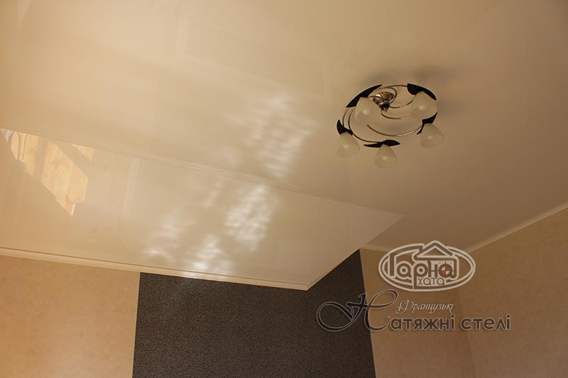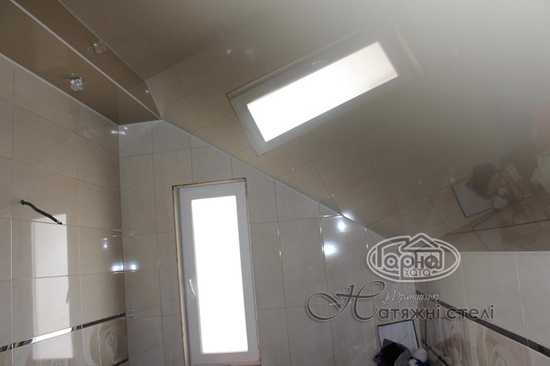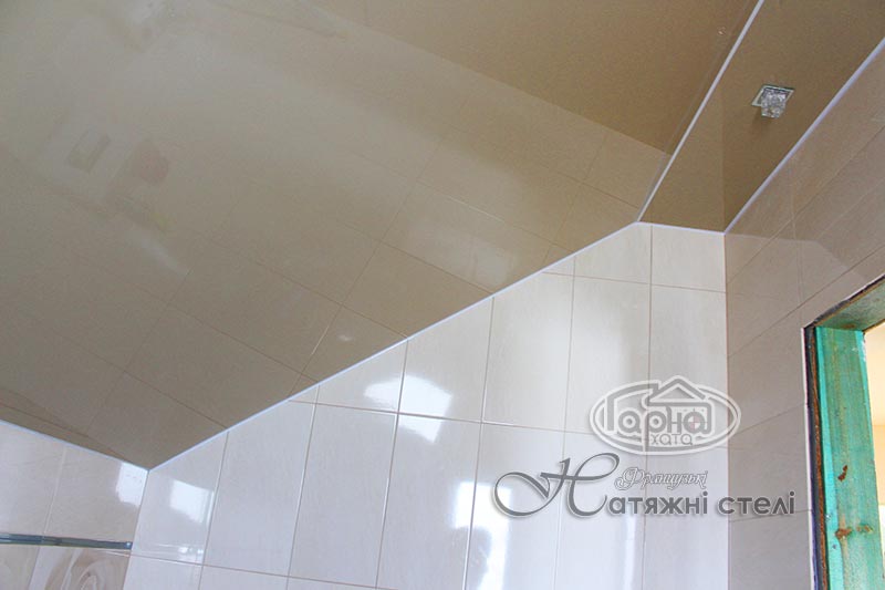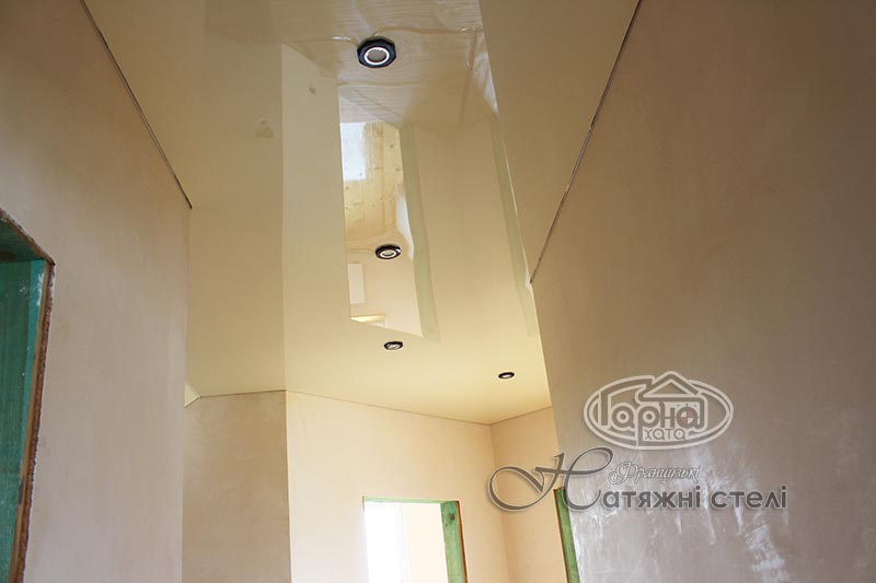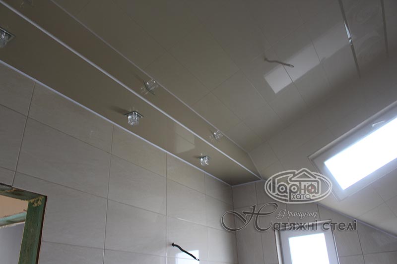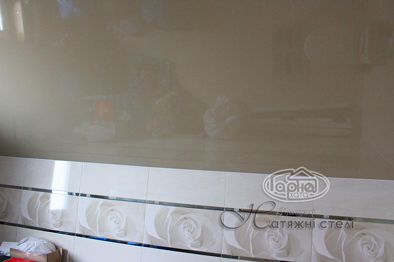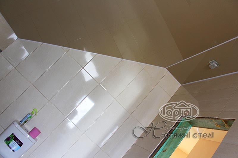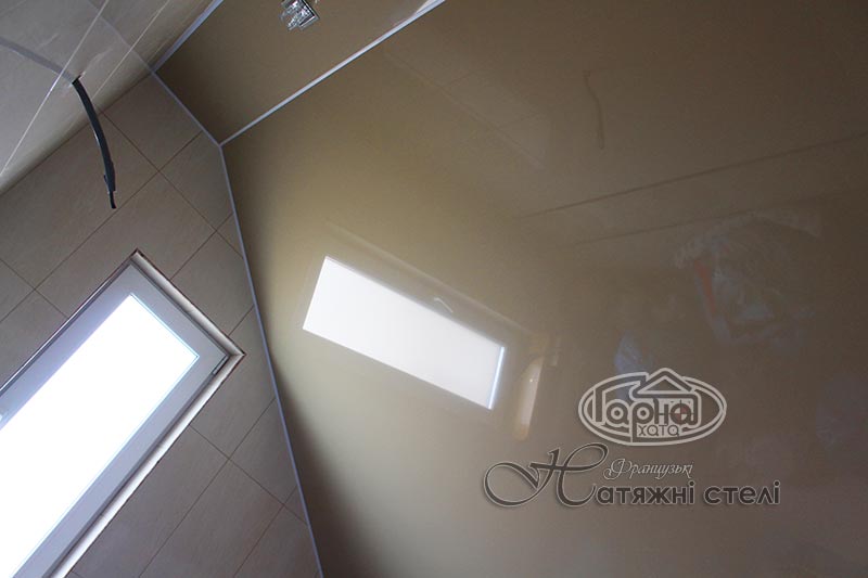В ванной был подобран цвет под декор плитку глянец (L 519). В коридоре установлен глянцевый потолок (L 501) с точечными светильниками. Кстати в точечные светильники или светильники находящихся на расстоянии которые находятся 15 см от потолка должны быть лед лампочки или эконом, чтобы не грело потолок. В настоящее время мы используем термо-кольца заводского производства, которые устойчивы к морозам но не греются и является сплошным сплавом.