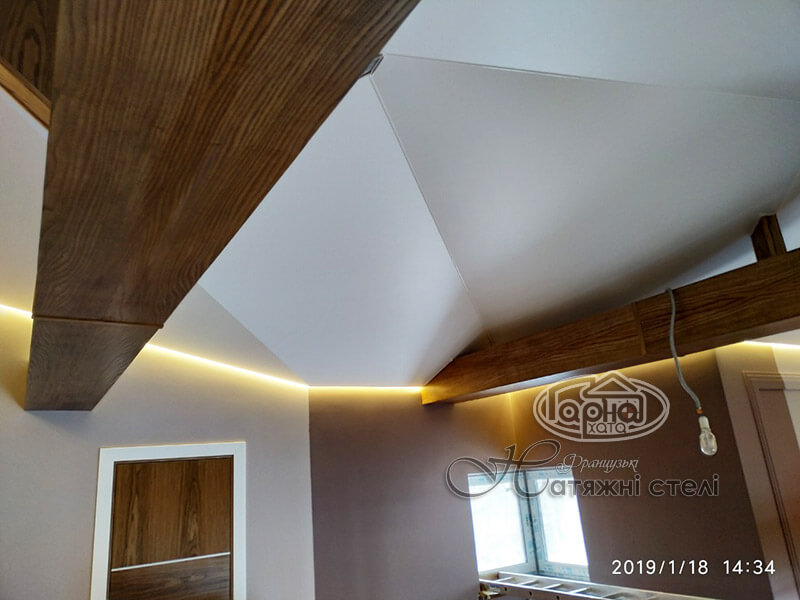 На стенах по периметру помещения устанавливают алюминиевые планки. Они представляют собой каркас под потолок. Затем закрепляют пленку в углы по диагонали. После этого потолок нагревают с помощью газового нагревателя, на которое в компании Гарна Хата есть допуски на газовое оборудование. Можно его тогда легко смонтировать в алюминиевые планки. Под воздействием температуры материал потолка увеличивает свой объем. Чтобы не повредить материал, в установке используется специальные средства.
