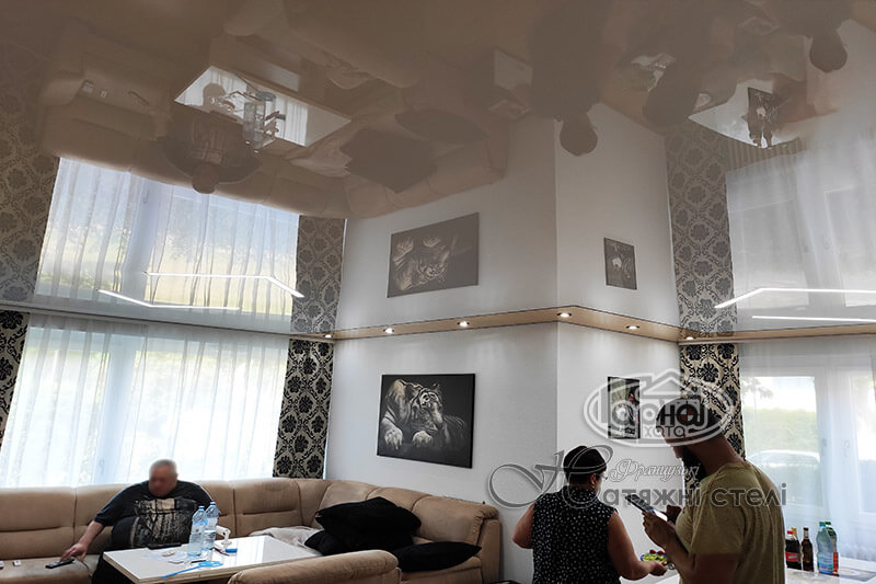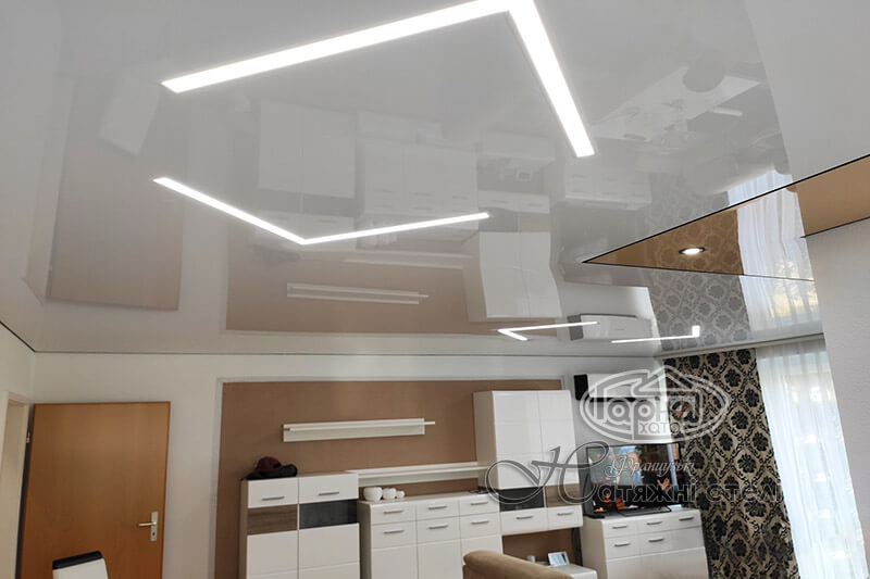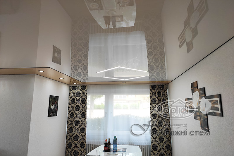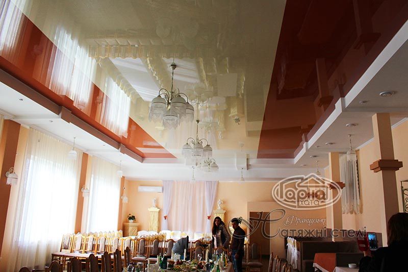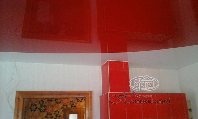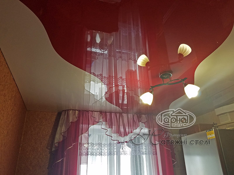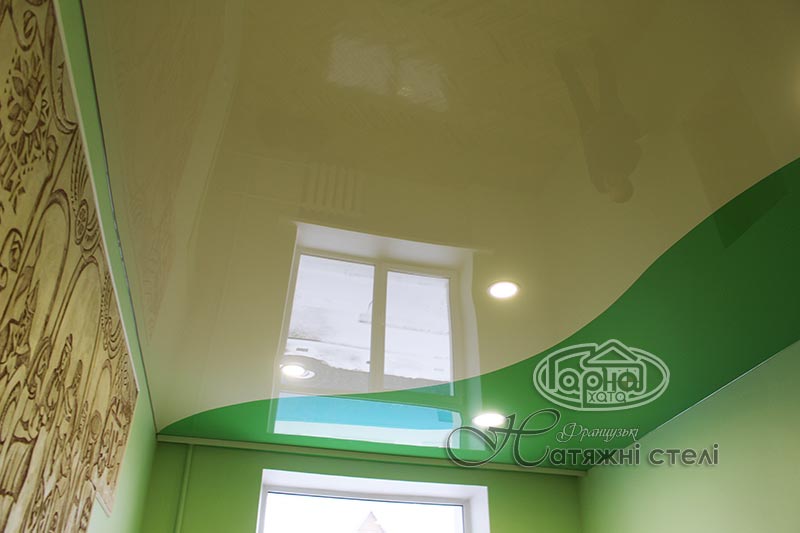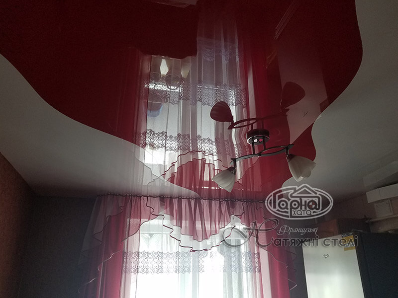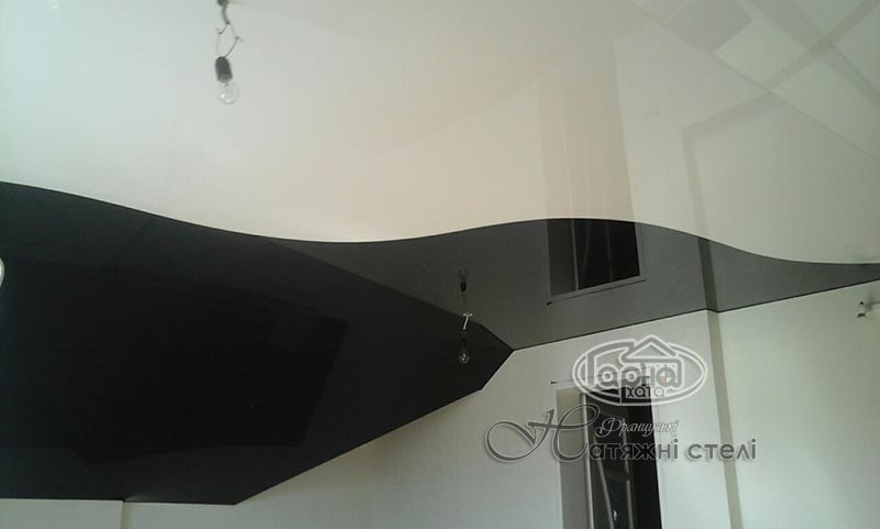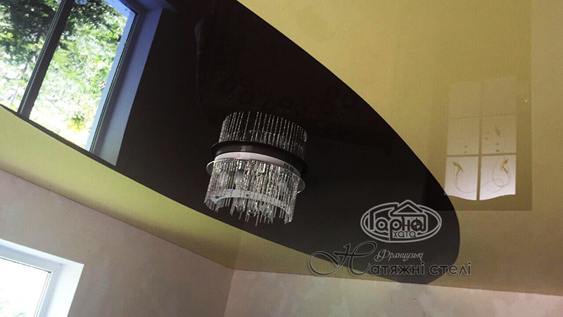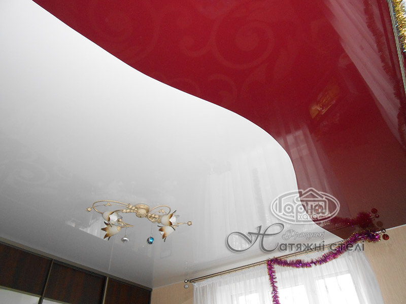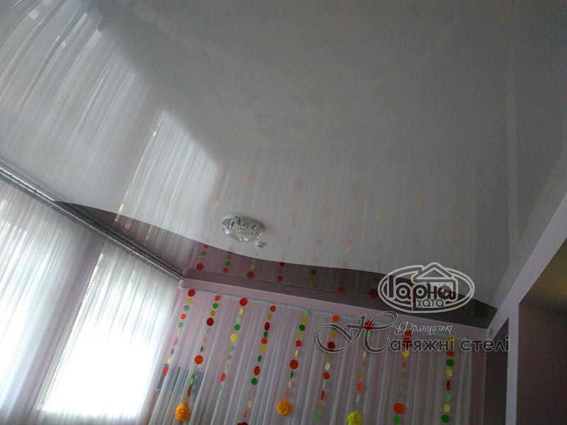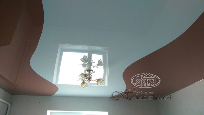- Спайка двох і більше полотен різного кольору дозволяє використовувати криволінійні стелі в різних стилях інтер’єру і розділяти простір на окремі зони.