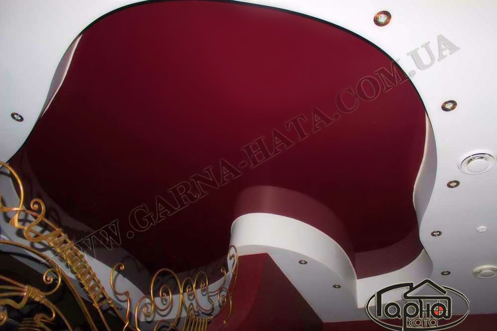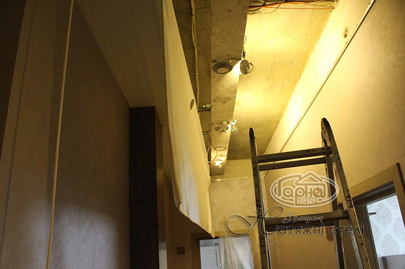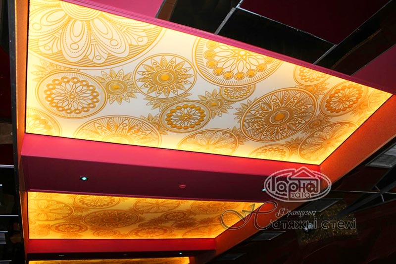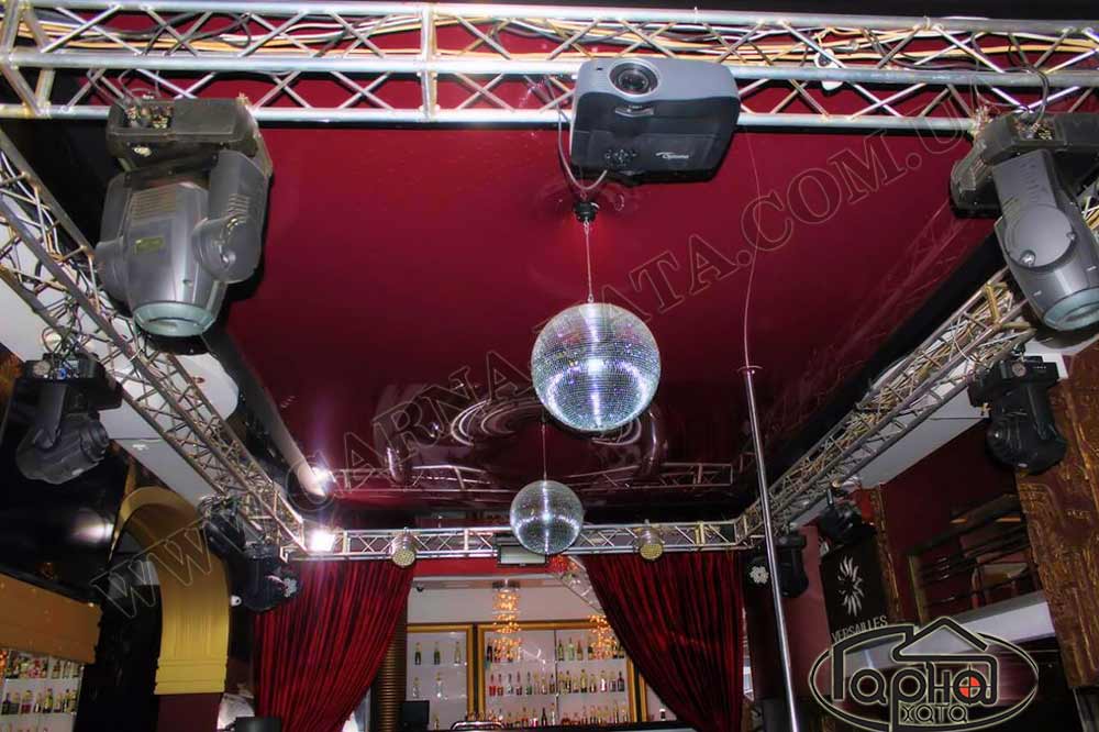Натяжні стелі в Луцьку, клубі Версаль. При вході наглядно встановлена коричнева глянцева стеля, яка візуально збільшує приміщення. Також в самому клубі де проходить дискотека в різних залах змонтовані натяжні стелі з фотодруком, які підсвічуються лед підсвіткою. Наші роботи є в самому готелі Версаль – це білі матові стелі в кожному номері.