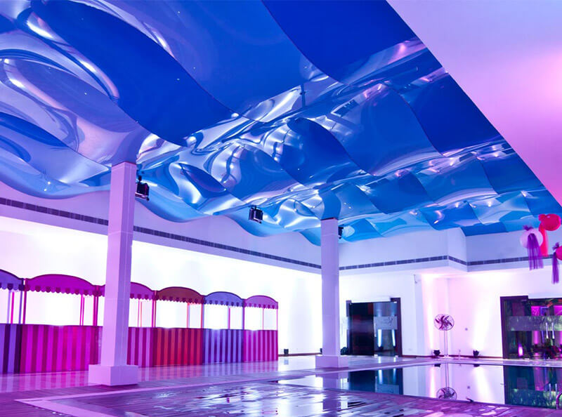 Сегодня в оформлении натяжного потолка используется не только белый цвет, но и различные оттенки, в том числе синий. Причем очень популярен как темно-синий чистый цвет, так и его производные — бирюзовый, кобальт, индиго, голубой, маренго и пр.
