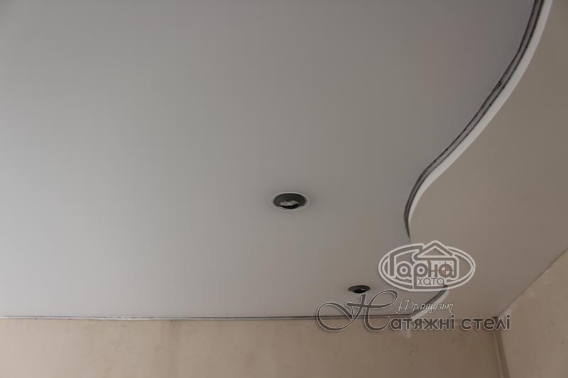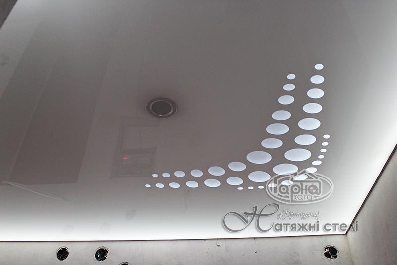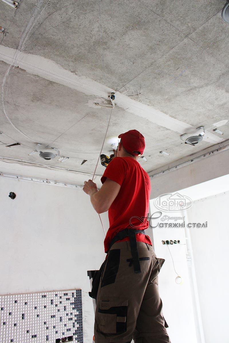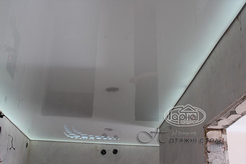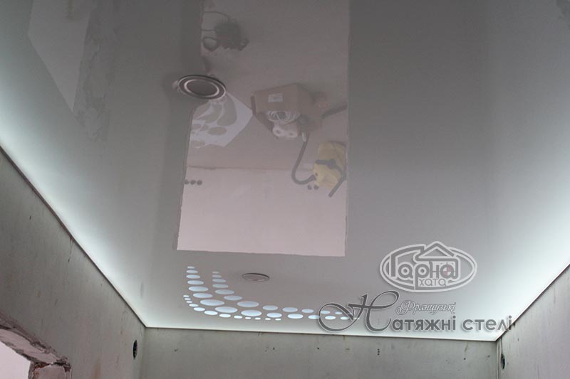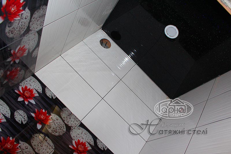 Недавно установленные натяжные потолки по всей квартире, на фото мы можем увидеть как процесс так и готовые потолки после монтажа. Установлен потолок Аплай, фон это ТРС пленка (прозрачная пленка которая пропускает свет) под ней лед освещения, а нижняя потолок белый глянец с перфорацией Аплай. В санузле установлен деко потолок искры (галактика) черный глянец. В комнате установлен синий глянец