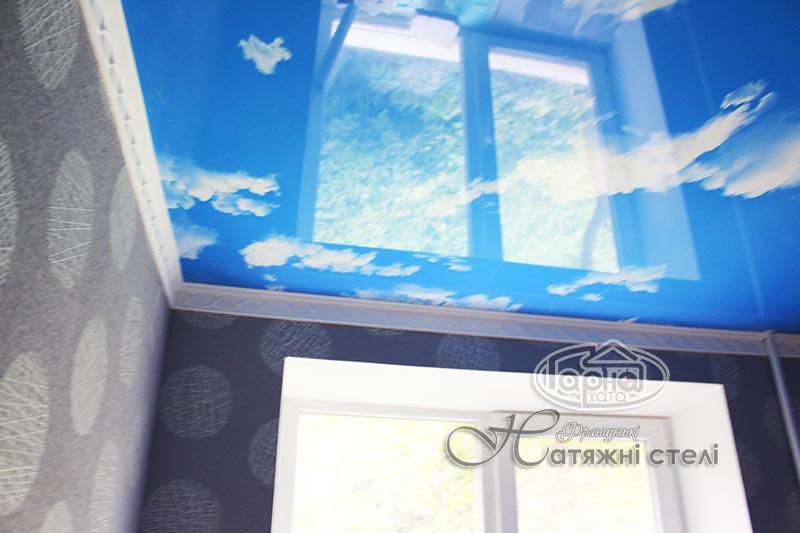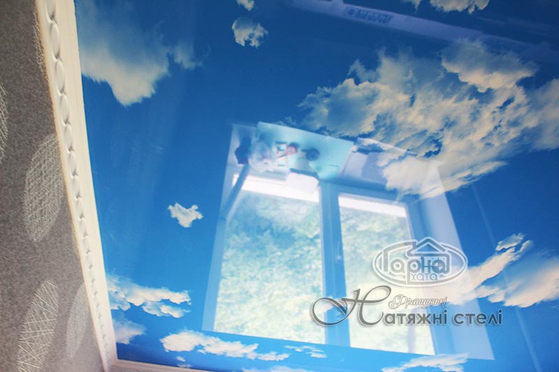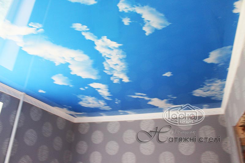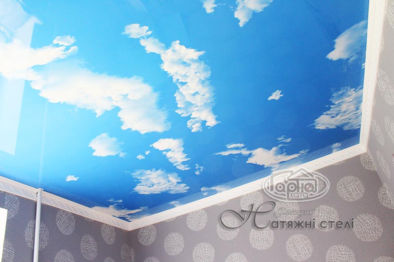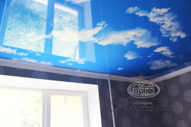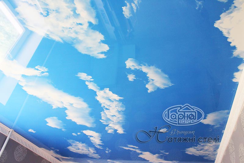 Это натяжные потолки с фотопечатью готового решения, а именно пленка «Небо». На синем благородном цвете кое-где виднеются облака. Это оригинальное решение такого потолка в детскую комнату или в прихожую комнату. Шикарно смотрится такой потолок в гипсокартонной конструкции или нашей двухуровневой потолка где по краям белый глянец или матовый потолок, а по середине НЕБО.