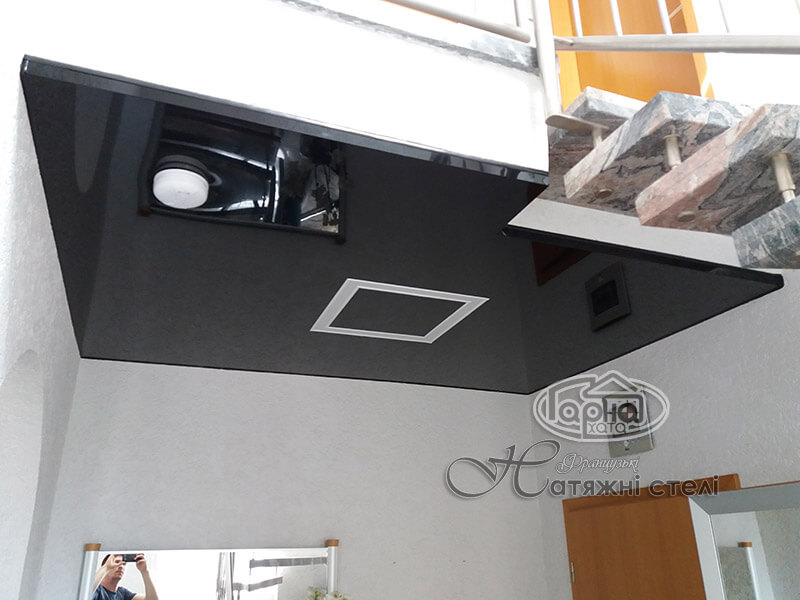 В коридоре установлен парящий натяжной потолок черного цвета. Установлены светильники квадраты.