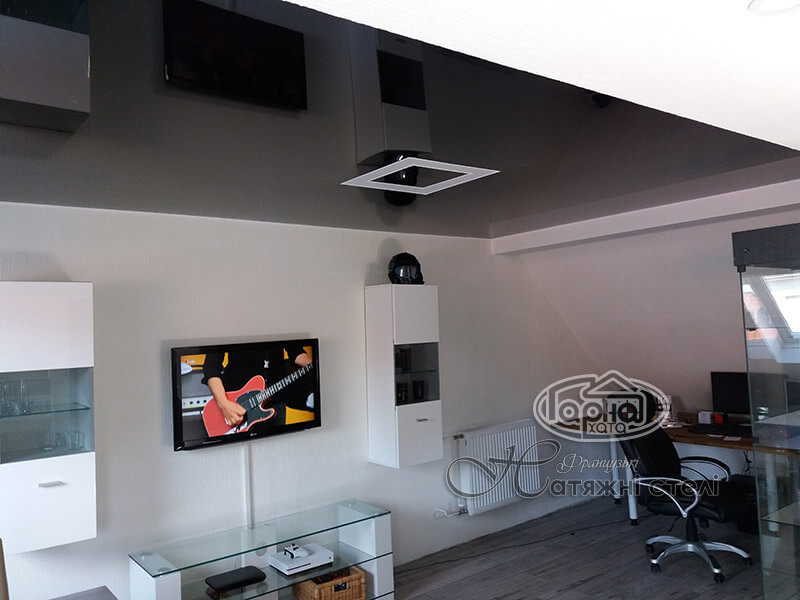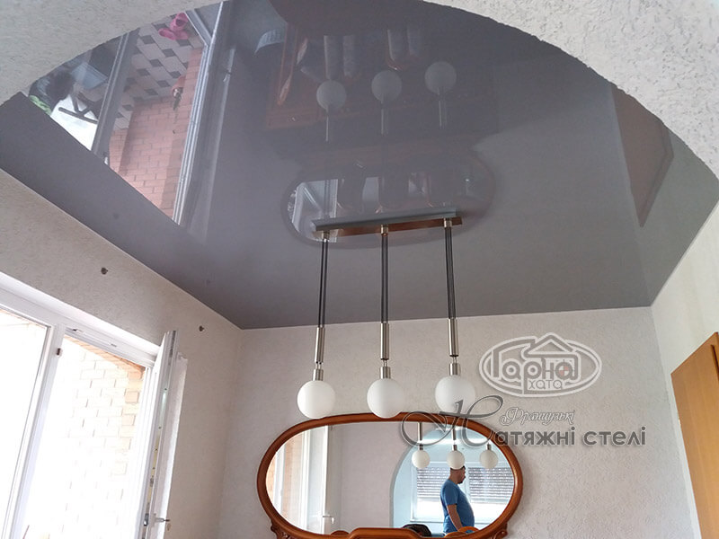 Установлен глянцевый натяжной потолок серого цвета в маленькой комнате.