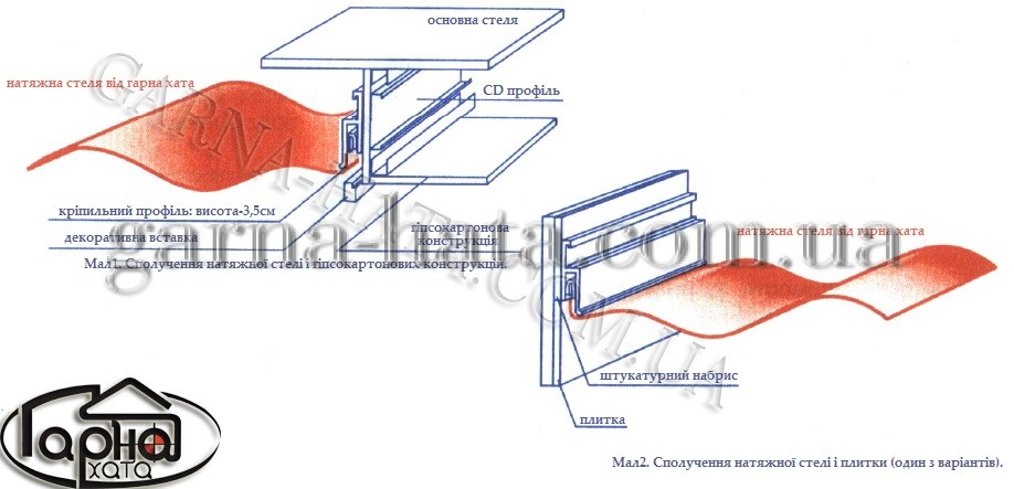 * на запланованому рівні натяжної стелі встановити в гіпсокартонній конструкції заставний ( CD -профіль) по всьому периметру (див. мал.);